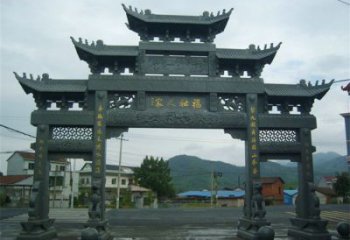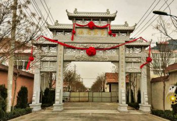 新農(nóng)村單門三樓花崗石雕門樓牌坊,是一種獨(dú)特的建筑風(fēng)格,來源于中國傳統(tǒng)的文化建筑。它采用了花崗石雕刻的門樓牌坊,在中國古代的建筑中很常見,但也有許多新的設(shè)計(jì)。