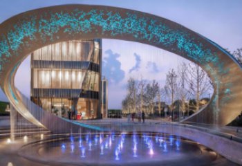 不銹鋼材質的景觀創意雕塑,以月為形,通體飾傳統肌理鏤空。它輕透靈動,既借不銹鋼適配戶外環境,又以鏤空引光影流轉,兼作框景裝置。人穿行其間,園景與天光在環中交織,成為場地里 “融于景、活于景” 的浪漫視覺核心。